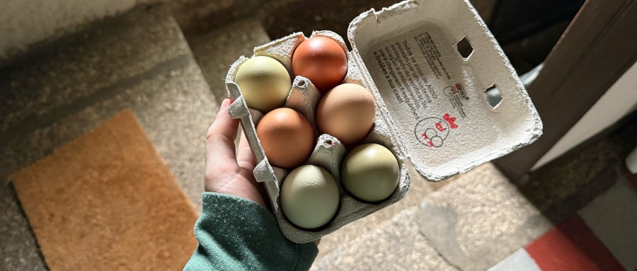 Seis ovos, seis cores. Qual Pantone, Benetton ou panettone — as nossas galinhas são a verdadeira campanha pela diversidade. Mais bicada menos bicada, na hora de dormir acabam sempre por se entender. Para além disso, põem todas os ovos no mesmo sítio. O querido leitor pense no que faz durante a sua manhã, e lembre-se de que, a cada uma dessas horas, há pelo menos uma galinha das nossas a pôr o ovo, com outra aflitinha para o fazer.